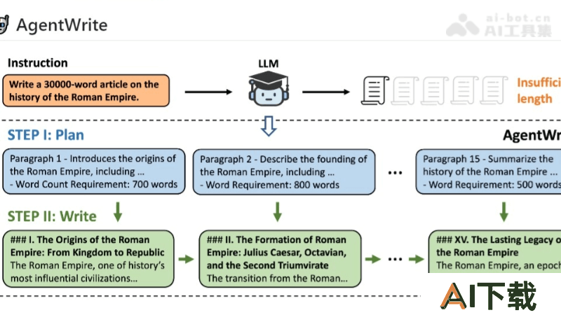 超长文本生成:LongWriter能生成超过10,000字的连贯文本,突破了以往AI模型在文本长度上的限制。数据集构建:通过创建”LongWriter-6k”数据集,包含从2,000到32,000字不等的写作样本,为模型训练提供了丰富的长文本数据。AgentWrite方法:使用现有LLMs自动构建超长输出SFT数据的方法,采用分而治之的策略,有效提升了模型的长文本生成能力。直接偏好优化(DPO):通过DPO技术进一步优化模型,提高输出质量和遵循长度约束的能力。LongWriter的技术原理